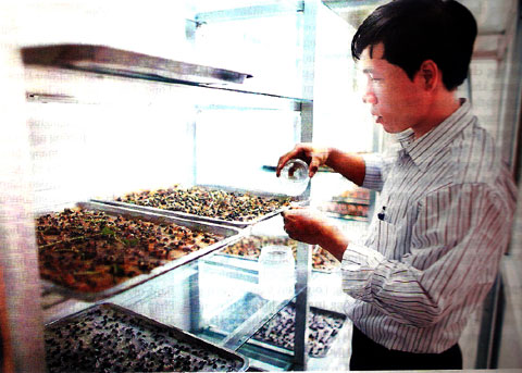 | Nghiên cứu sinh Lê Quang Cường chăm sóc mầm đậu mới gieo. Đậu này được sử dụng để nuôi rệp mà rệp lại là “thực phẩm” của ong mắt đỏ. Ảnh: Tuổi trẻ |